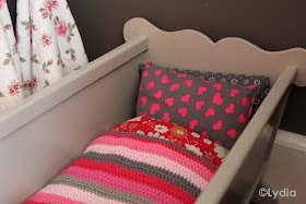 Bij het rondje foto's maken viel m'n oog ook op het speelhoekje van Lisanne. Ergens vorige zomer nam ik een keer bij de kringloop een leuk poppenbedje mee. Hij was zachtgeel met mintgroen geverfd. Best schattig, maar niet echt mijn kleur... Dus toen ik van de winter boven aan het verven was, gaf ik ook het poppenbedje een grijs laagje verf. Later maakte ik van wat restlappen nog nieuwe hoezen om het matrasje, dekbedje en de kussentjes. Nog een fleurig gehaakt dekentje erbij. En de pop kan weer heerlijk slapen. En ook niet onbelangrijk: het poppenmoedertje was er erg blij mee!